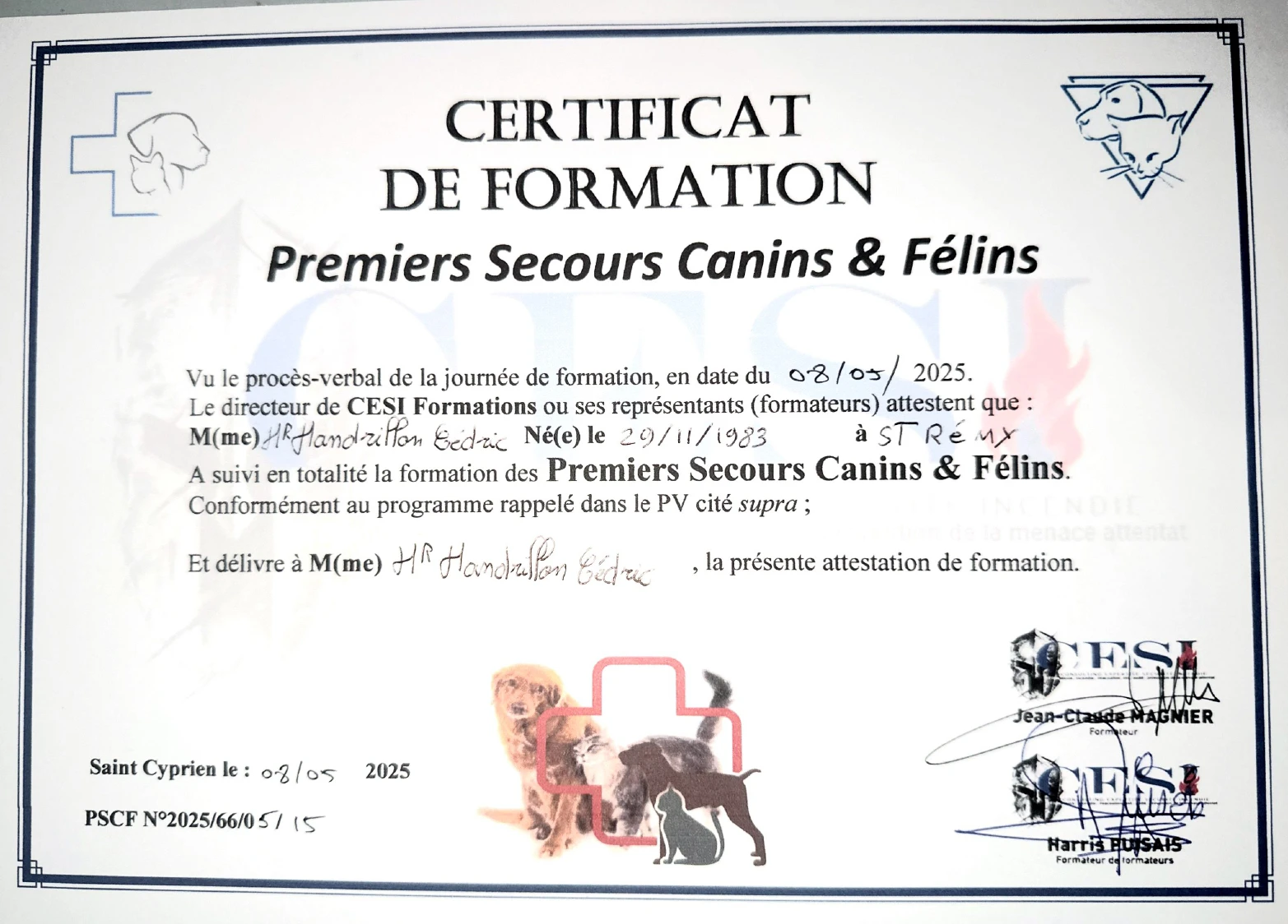 À l’issue de cette formation, il a obtenu son certificat de secouriste animalier, lui permettant d’intervenir efficacement en situation d’urgence.