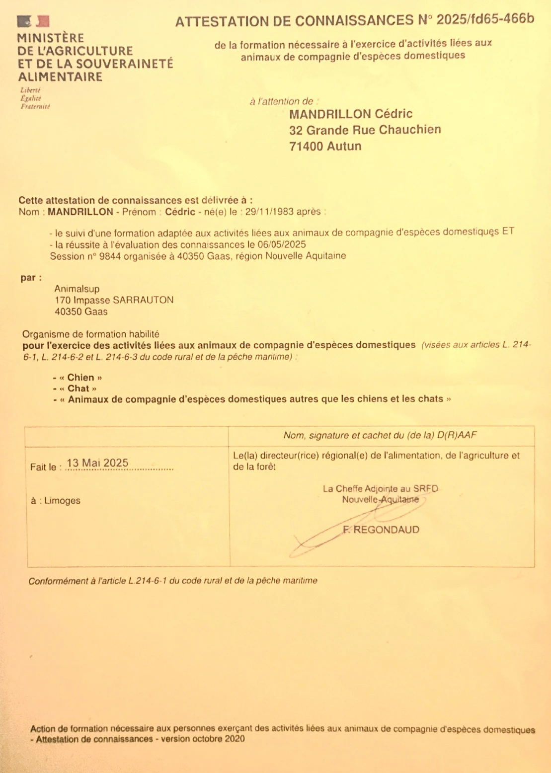 Il a bénéficié d’une préparation rigoureuse en amont, lui permettant de réussir cette certification indispensable à toute activité professionnelle animalière.