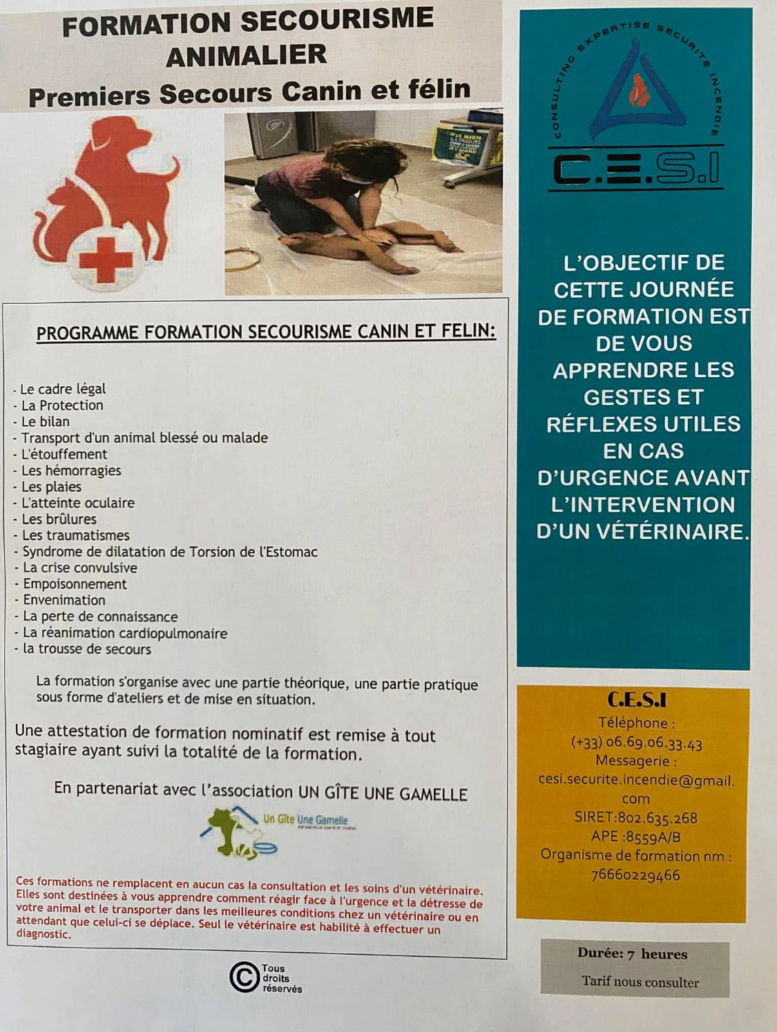 Le 8 mai 2025, Cédric a suivi, sur son temps personnel, une formation en présentiel aux premiers secours canins et félins, organisée dans les locaux du refuge Un Gîte Une Gamelle, près de Perpignan.
